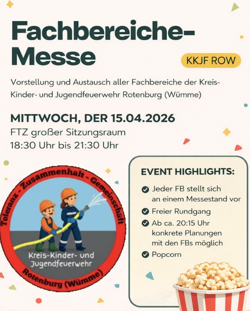 Hier stellen sich alle Fachbereiche der Kreis-Kinder- und Jugendfeuerwehr Rotenburg vor und geben spannende Einblicke in ihre Arbeit. Die Messe bietet die ideale Möglichkeit, die vielfältigen Aufgaben kennenzulernen und sich über Engagementmöglichkeiten zu informieren. Wer Interesse hat, kann sich direkt vor Ort einbringen und Teil eines Fachbereichs werden.